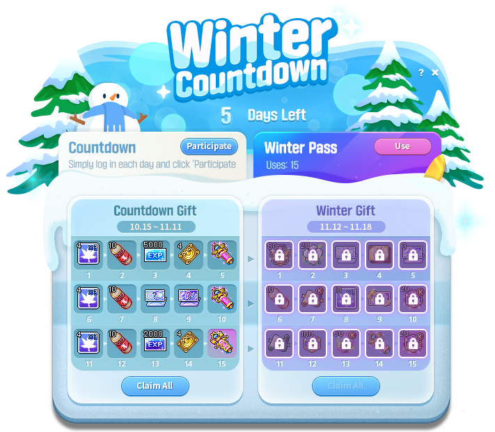 • The wait is over! Claim your Winter Gifts based on the total number of times you participated in the Winter Countdown event.
